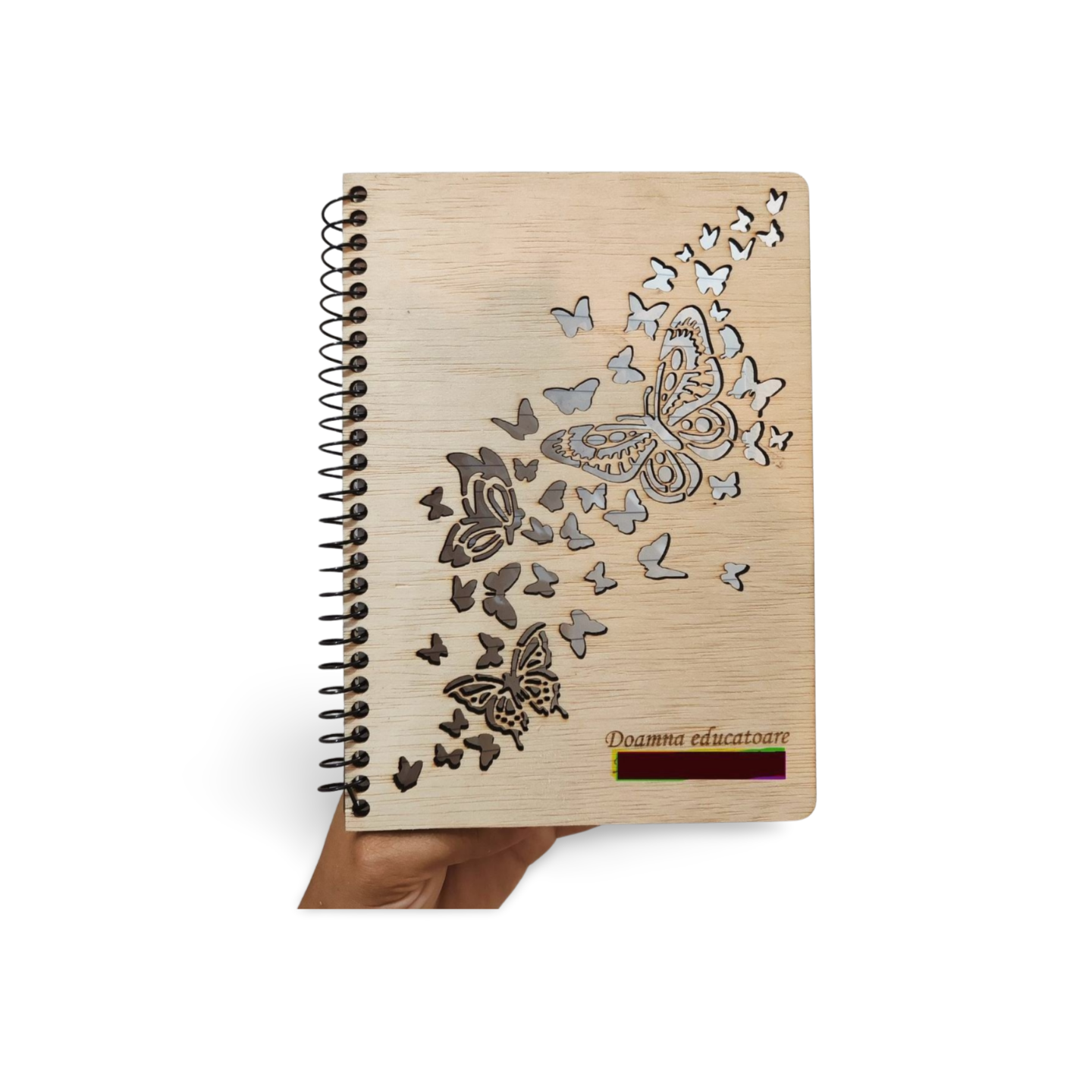 Transformă fiecare notiță într-o amintire deosebită cu această agendă elegantă cu coperți din lemn, decupate delicat cu un model de fluturi în zbor. Un cadou unic și rafinat, ideal pentru educatoare, profesori, mămici sau oricine apreciază lucrurile frumoase și naturale.