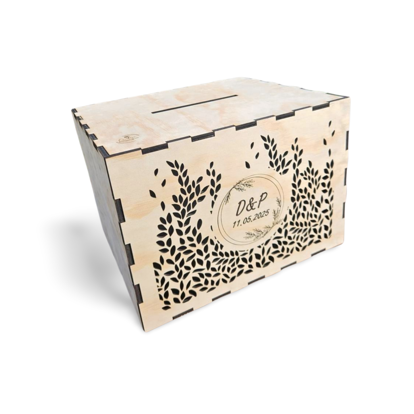Transformă momentul darului într-un adevărat spectacol de eleganță cu această cutie de nuntă personalizată, realizată din lemn de pin de calitate superioară, cu grosimea de 6 mm. Cu un design de frunze decupat cu precizie laser și o personalizare unică, această piesă devine rapid un punct de atracție la orice nuntă.
