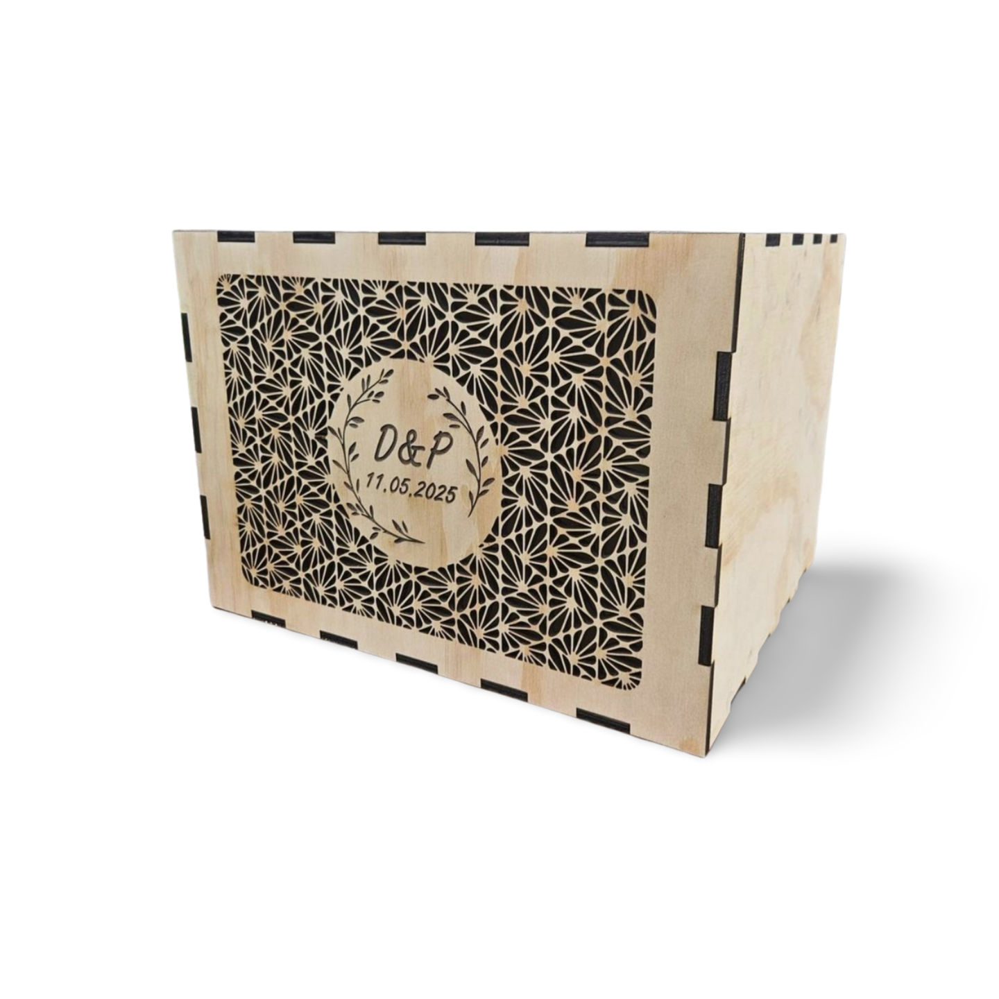 Transformă momentul darului într-un adevărat spectacol de eleganță cu această cutie de nuntă personalizată, realizată din lemn de pin de calitate superioară, cu grosimea de 6 mm. Cu un design floral japonez decupat cu precizie laser și o personalizare unică, această piesă devine rapid un punct de atracție la orice nuntă.