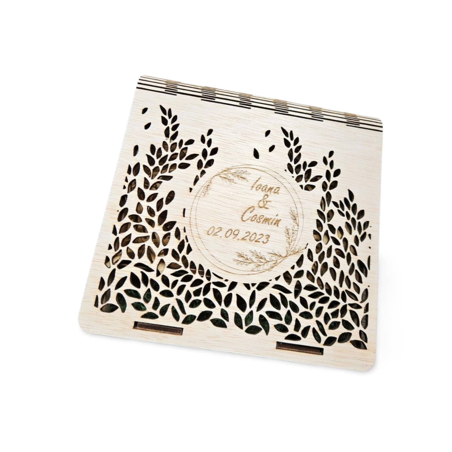 Cutie elegantă din placaj de lemn de pin (4 mm grosime), ideală pentru fotografii de nuntă. Capacul este gravat cu numele mirilor și data evenimentului, înconjurate de un model floral decupat, oferind un aspect natural și rafinat.