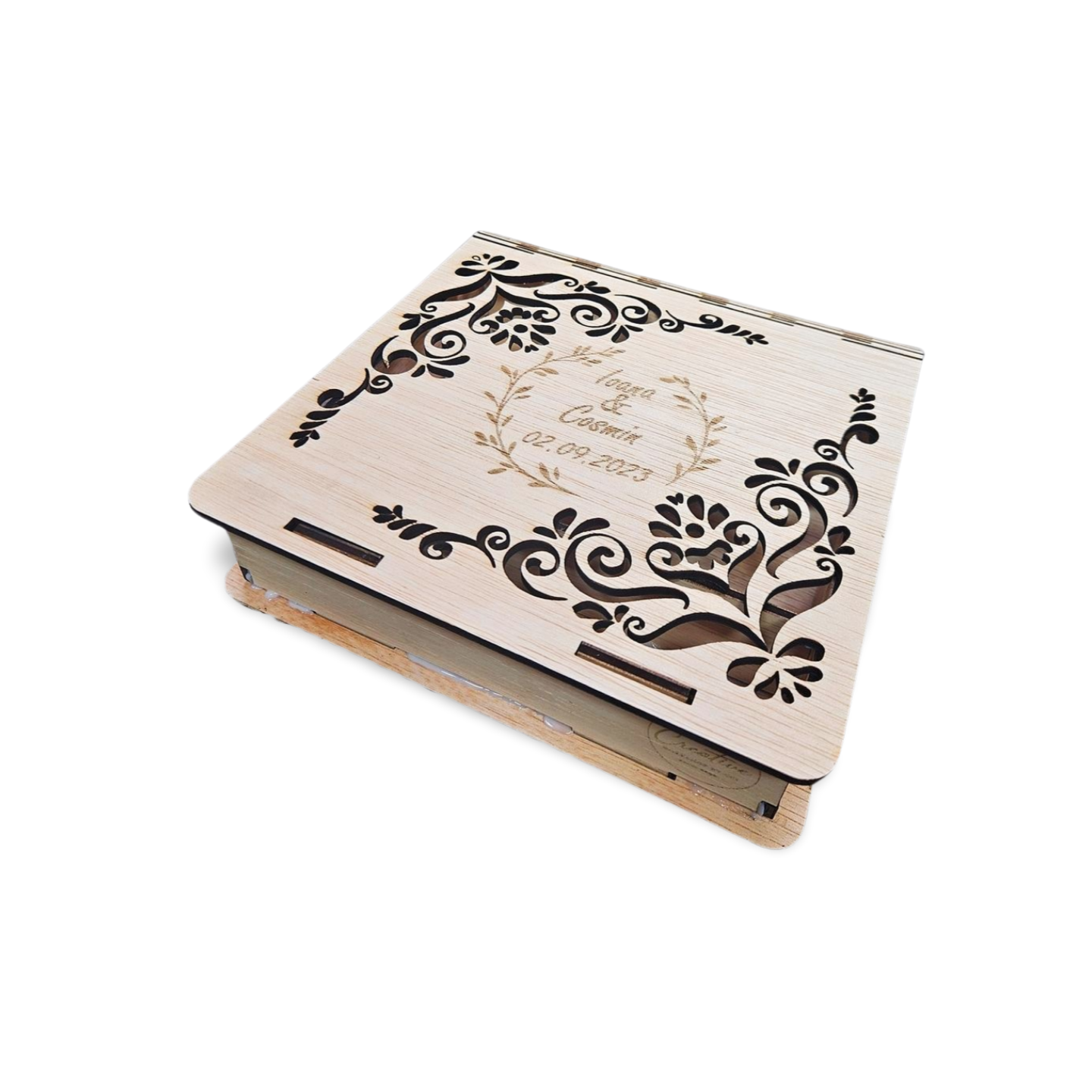 Această cutie elegantă este realizată din placaj de lemn de pin cu grosimea de 4 mm, fiind ideală pentru fotografii profesioniști care doresc să ofere un cadou memorabil mirilor. Capacul este decorat cu un design floral decupat și gravat cu numele mirilor și data evenimentului – un detaliu personalizat care adaugă un plus de rafinament și valoare sentimentală.