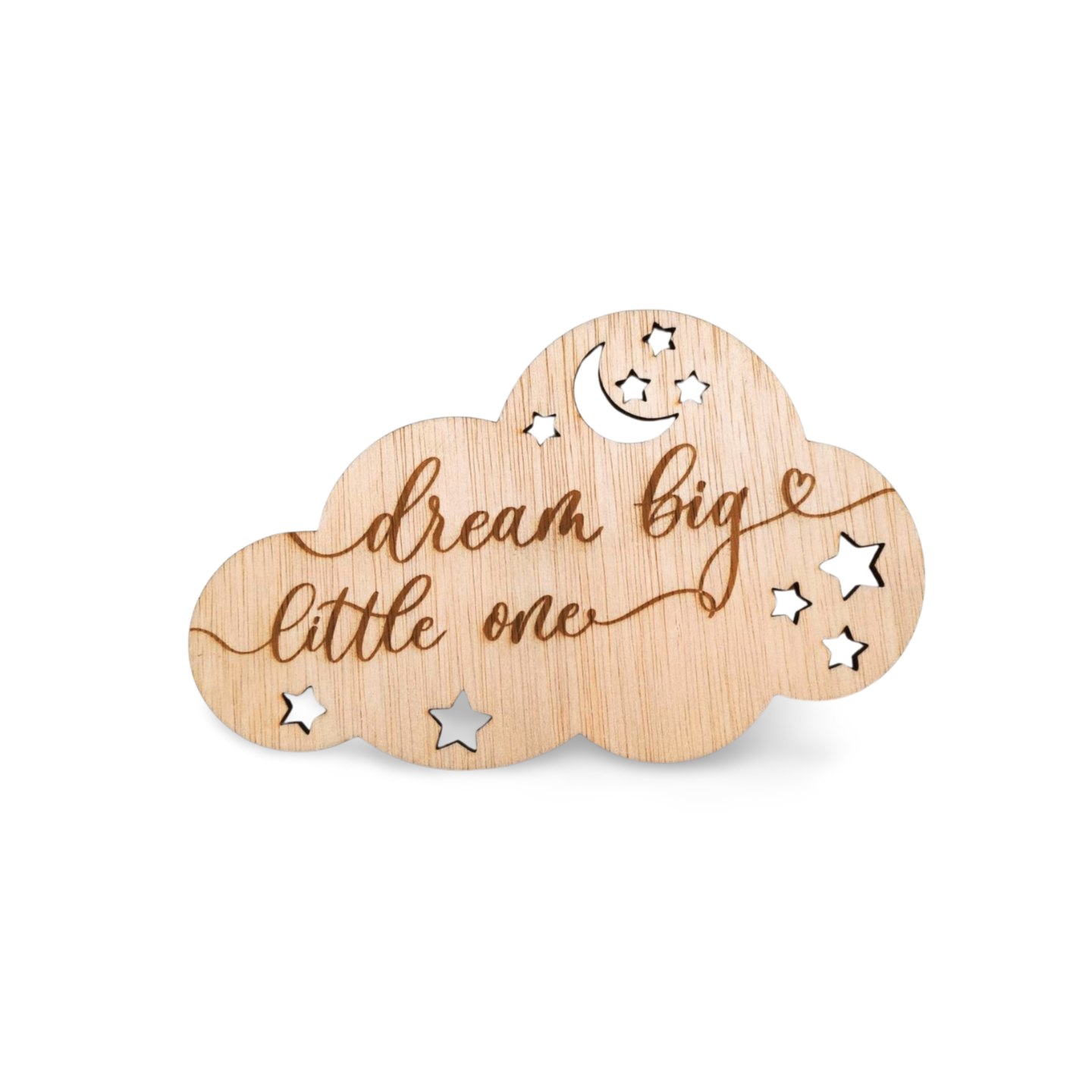 O piesă delicată și inspirațională pentru camera copilului, această decorațiune din lemn în formă de nor poartă gravat mesajul „dream big little one” – o invitație la visare și încredere în propriul drum. Ideală pentru decor de perete, cadou de botez sau fotografie de newborn.