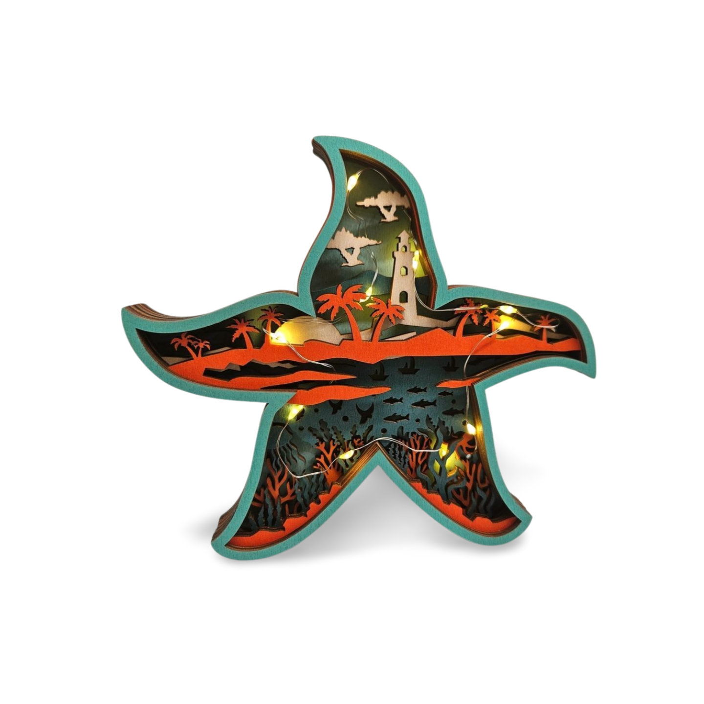 Adaugă un aer de vacanță și prospețime în casa ta cu această decorațiune luminoasă din lemn, în formă de stea de mare! Designul său delicat și natural evocă frumusețea oceanului, iar lumina caldă LED aduce un strop de liniște și relaxare în orice colț al casei.
