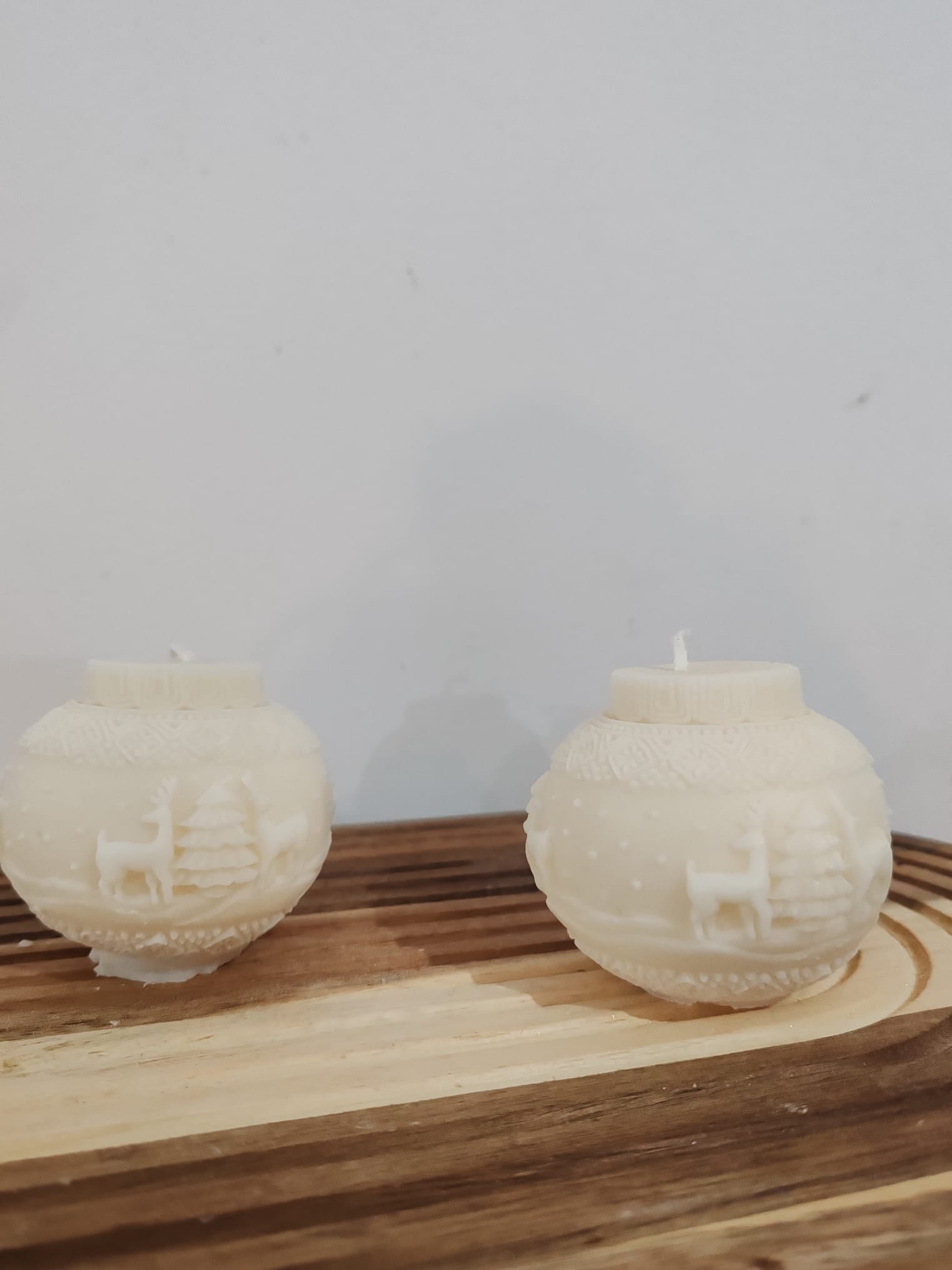 Această lumânare în formă de glob de Crăciun aduce un plus de magie și rafinament decorului tău festiv. Cu motive delicate în relief – brăduți, reni și model de pulover tradițional – globul luminează cald și discret, transformând orice încăpere într-o poveste de iarnă.