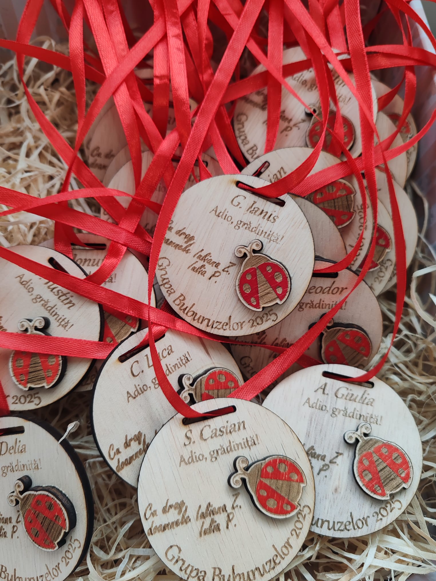 Transformă despărțirea de grădiniță într-o amintire de neuitat cu aceste medalii din lemn, create special pentru copiii din Grupa Buburuzelor. O combinație perfectă de emoție, culoare și personalizare!