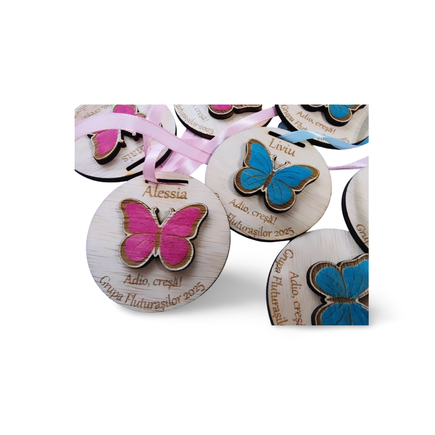 O amintire delicată și colorată pentru copiii din Grupa Fluturașilor! Aceste medalii din lemn, realizate cu grijă și personalizate cu numele fiecărui copil, sunt perfecte pentru a marca cu emoție finalul grădiniței.
