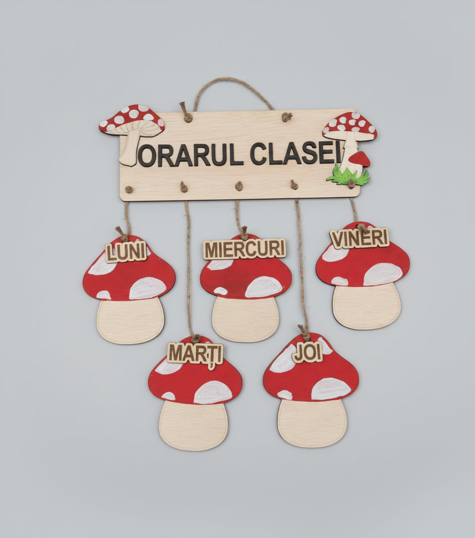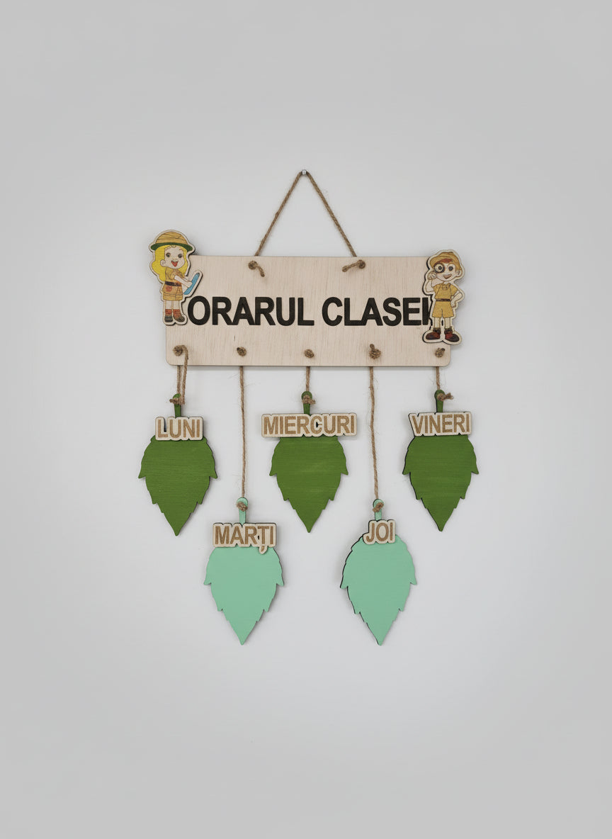 Un orar vesel și creativ, realizat din lemn natural, perfect pentru a aduce organizare și bună dispoziție în sala de clasă sau acasă. Modelul „Clasa Inimioarelor” îmbină plăcuțele cu zilele săptămânii și inimioarele roșii decorative, creând un design atractiv și prietenos pentru cei mici.