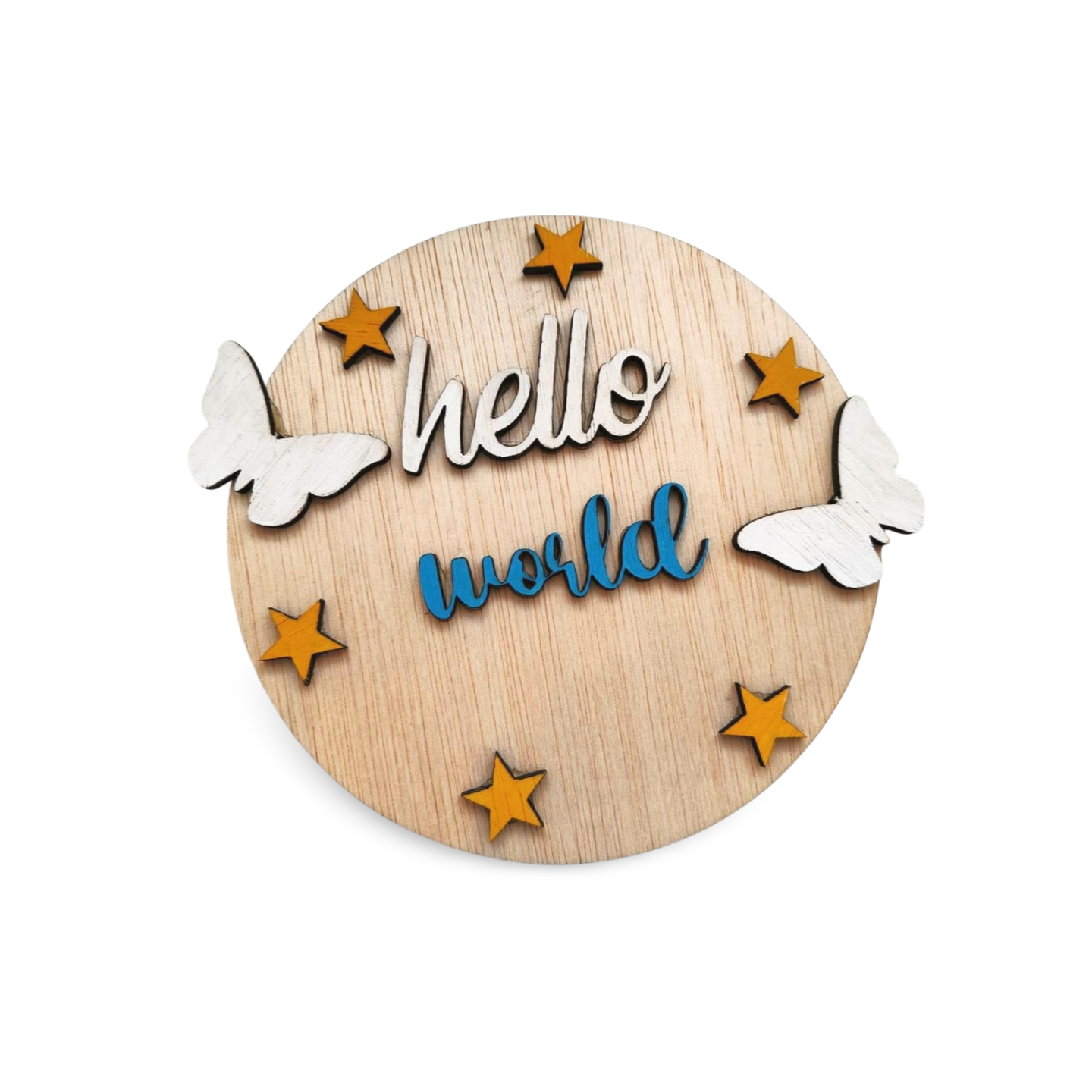 Bine ai venit pe lume, micuțule! Această plăcuță rotundă din lemn, cu textul „Hello World” în nuanță albastră, este alegerea perfectă pentru primele ședințe foto ale bebelușului sau pentru decorul camerei unui băiețel. Designul minimalist și elegant o face ideală și ca accesoriu de baby shower sau cadou de bun venit.