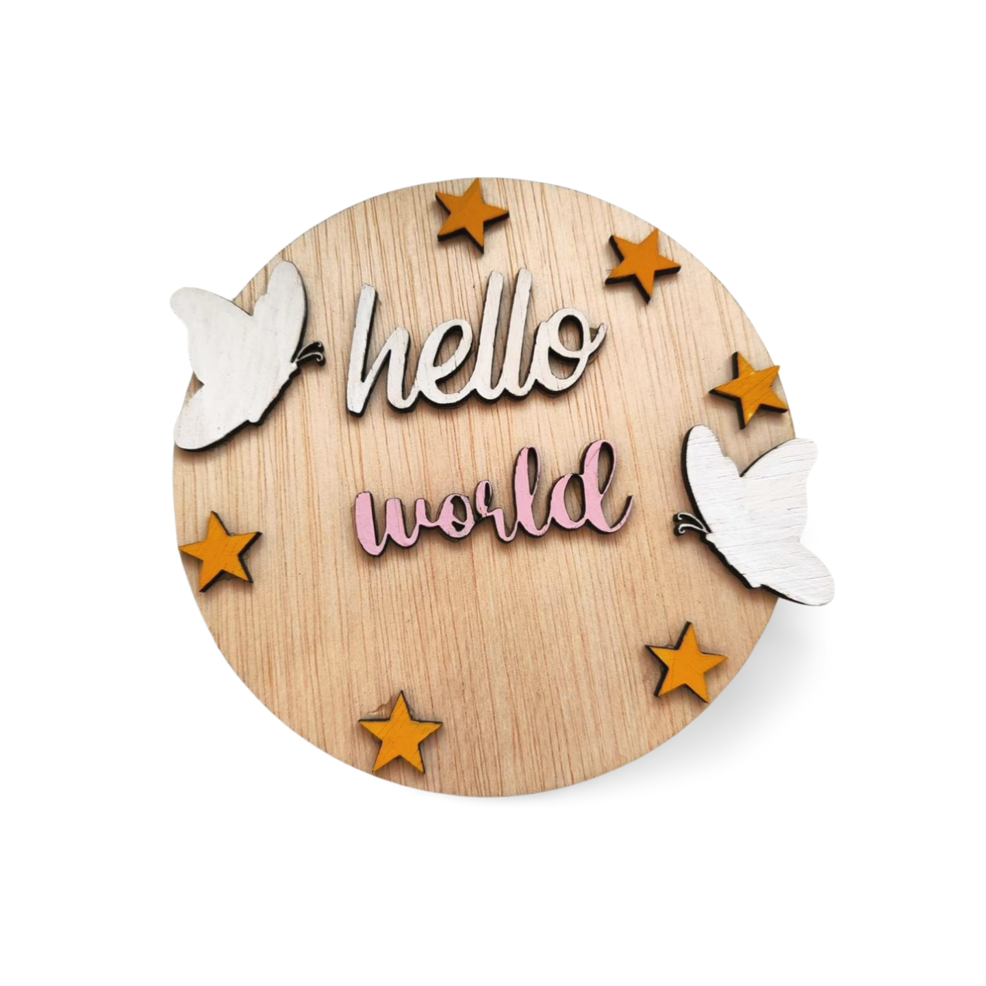 Celebrează venirea pe lume a fetiței tale cu această adorabilă plachetă „Hello World”, realizată din lemn și decorată cu scris roz. Ideală pentru sesiunile foto newborn, dar și ca piesă decorativă în camera copilului, această plăcuță aduce o notă dulce și elegantă oricărui spațiu.