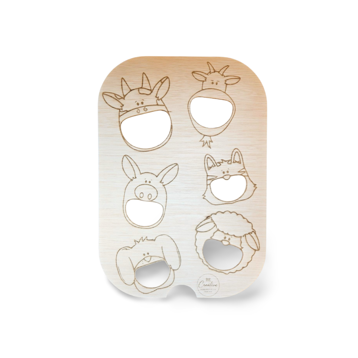 Placa este gravată cu 6 animale simpatice (vacă, capră, porc, vulpe, cățel, oaie) și poate fi folosită cu elemente precum pom-pom-uri, paste, biluțe sau boabe (sub supraveghere), pentru a simula hrănirea.