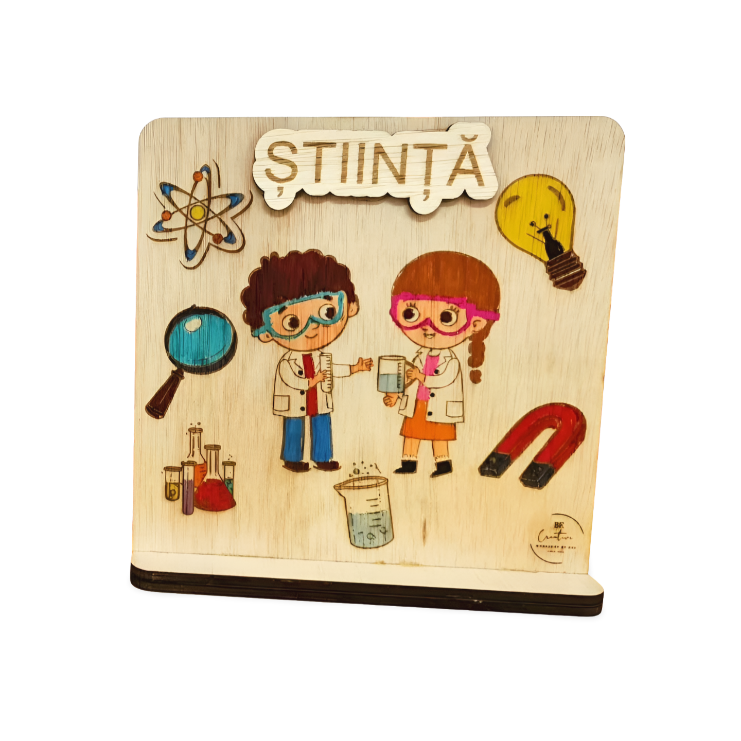 Această plachetă din lemn de pin de 4 mm și dimensiunea de 18x18 cm este destinată centrului „Știință” din grădinițe. Gravată și pictată manual cu elemente precum lupă, bec, magnet, ustensile de laborator, etc., placheta include un text gravat și decupat, aplicat pentru un aspect modern și prietenos. Ideală pentru stimularea curiozității și organizarea mediului educațional.
