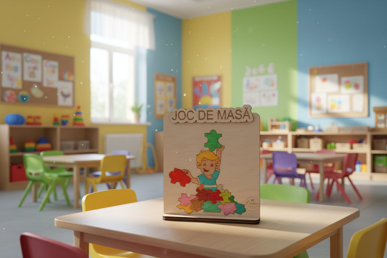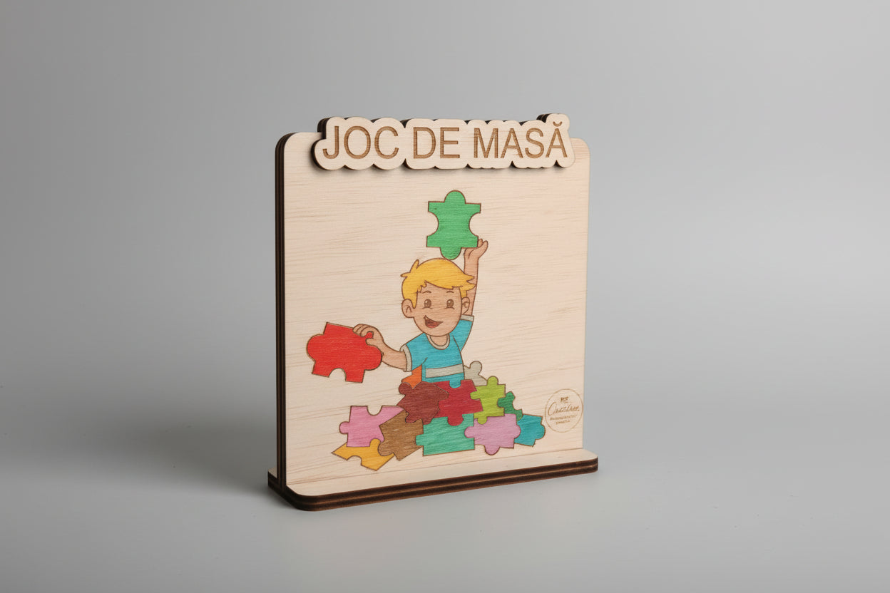 Placheta este realizată din lemn, cu un design prietenos și educativ, ilustrând un copil care se joacă cu piese de puzzle – simbol al gândirii logice, al concentrării și al învățării prin joc. Textul „JOC DE MASĂ” este decupat și aplicat în relief, oferind un aspect modern, vizibil și ușor de recunoscut de către cei mici.
