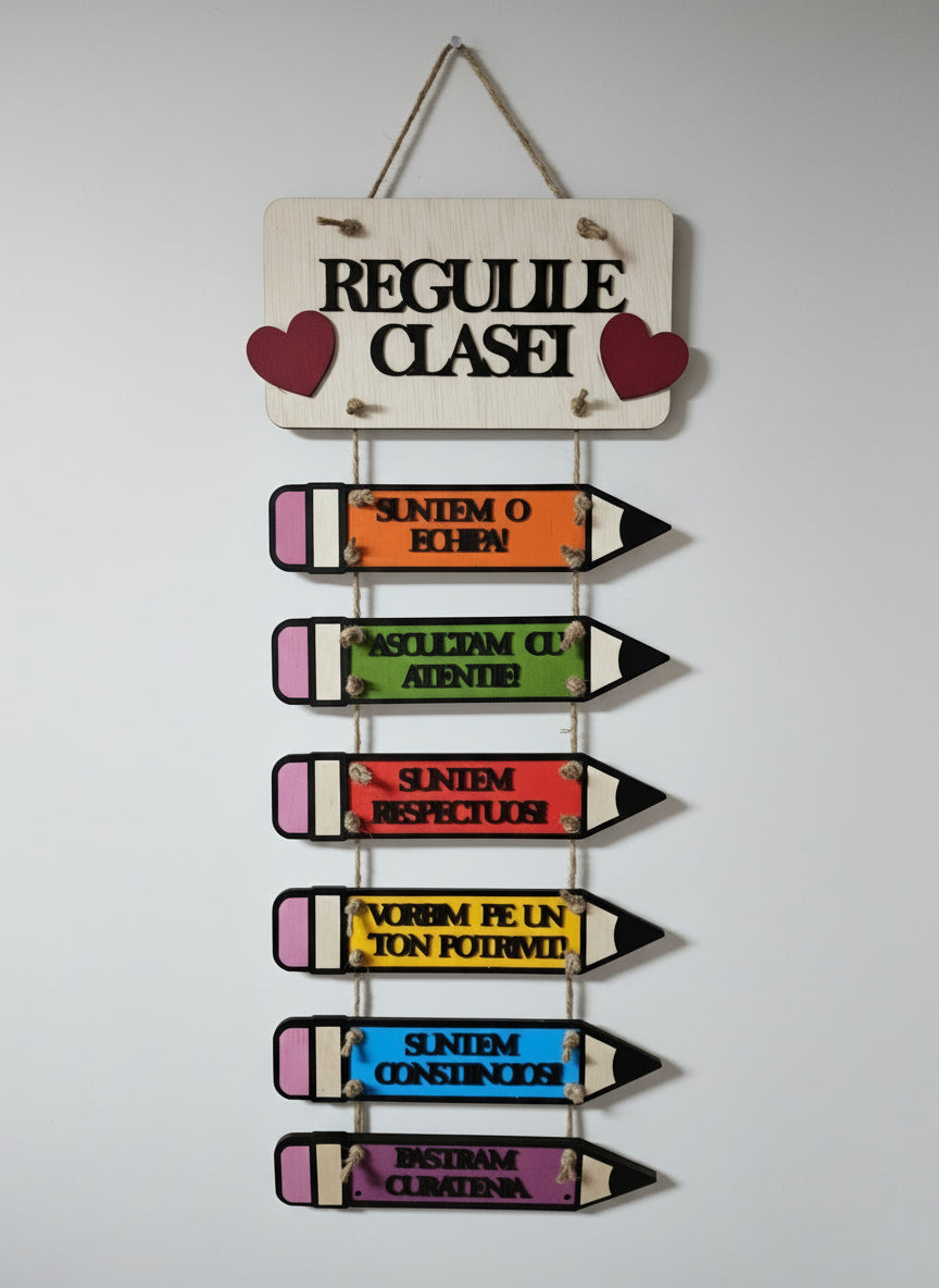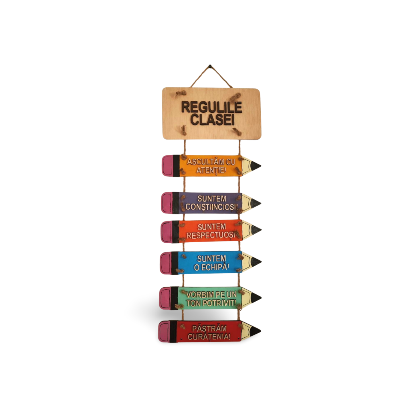 Transformă sala de clasă într-un spațiu primitor, vesel și educativ cu această plachetă din lemn cu mesajul „Regulile Clasei”, completată de 6 creioane decorative suspendate, fiecare ilustrând câte o regulă importantă. O piesă decorativă și funcțională, care încurajează respectul, buna purtare și cooperarea între copii.
