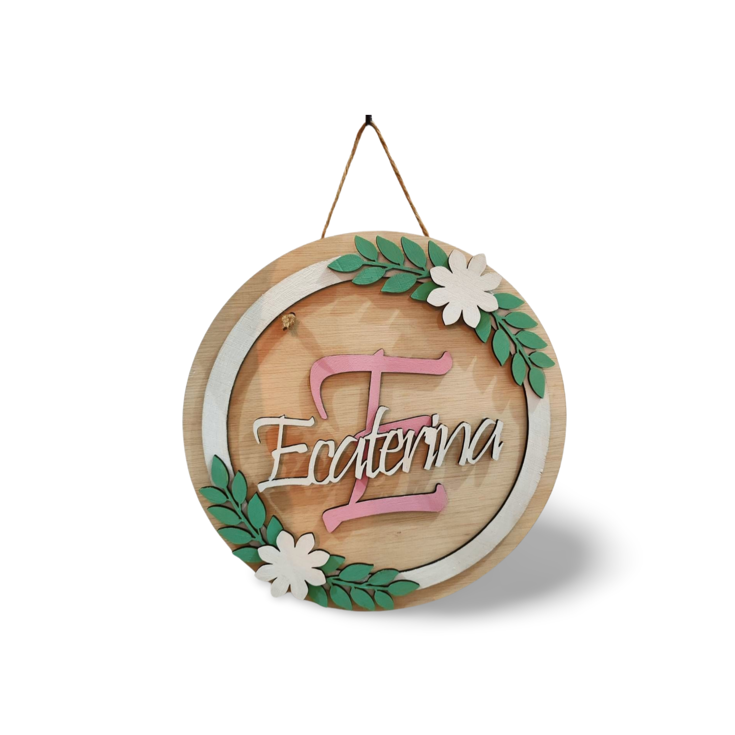 Prima literă a numelui copilului, mare și elegant decupată, se evidențiază pe fundalul acestei plachete delicate, iar peste ea, numele complet este lipit în relief, creând un efect spectaculos și sofisticat. Decorul este completat cu frunze fine și flori delicate, așezate cu grijă pe margine, pentru un plus de rafinament și naturalețe.