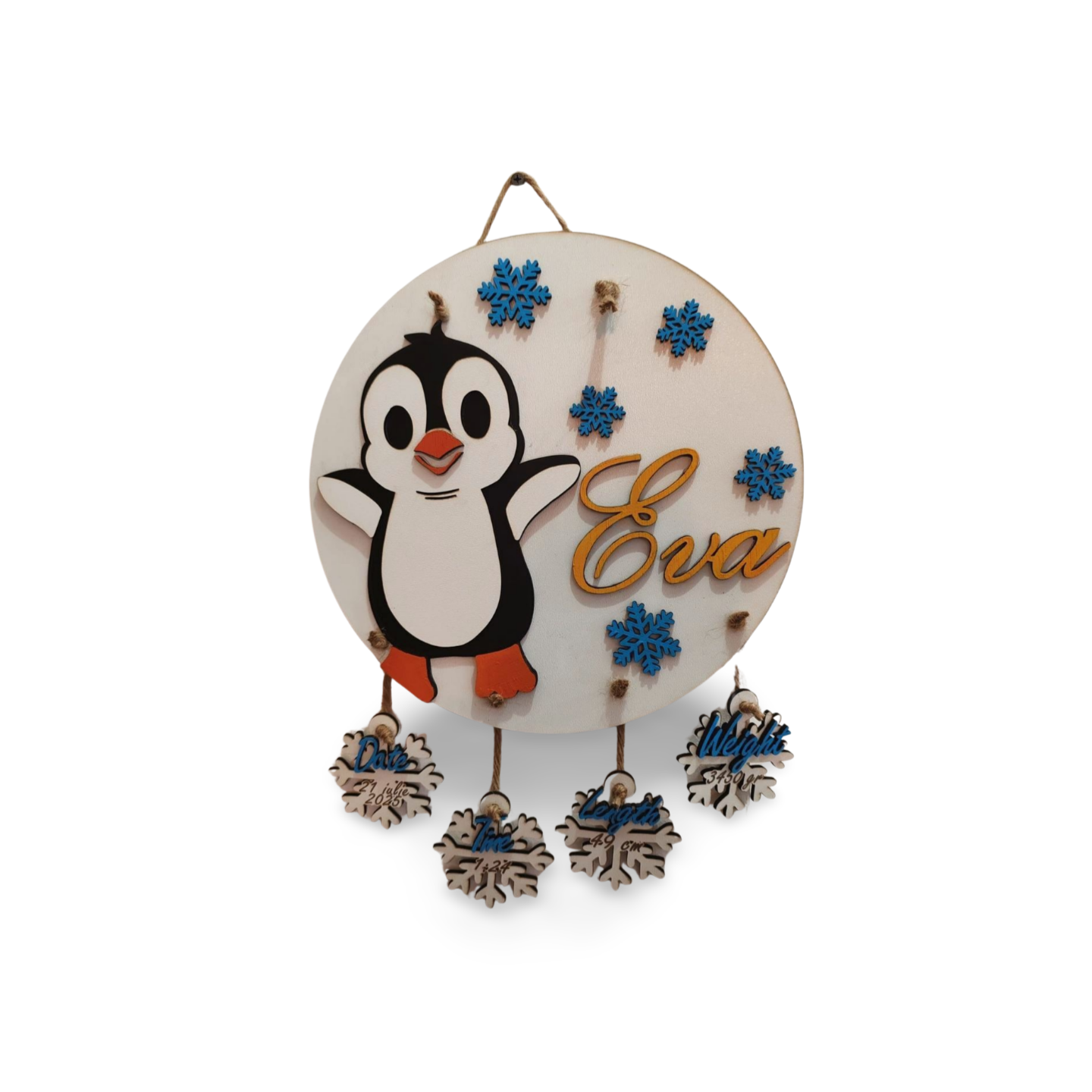 Un simpatic pinguin își deschide aripioarele în semn de bun venit, vegheat de fulgi albaștri de zăpadă ce plutesc jucăuș în jurul numelui copilului, decupat și lipit în relief. Această plachetă din lemn este o piesă unică ce surprinde bucuria începutului de viață.