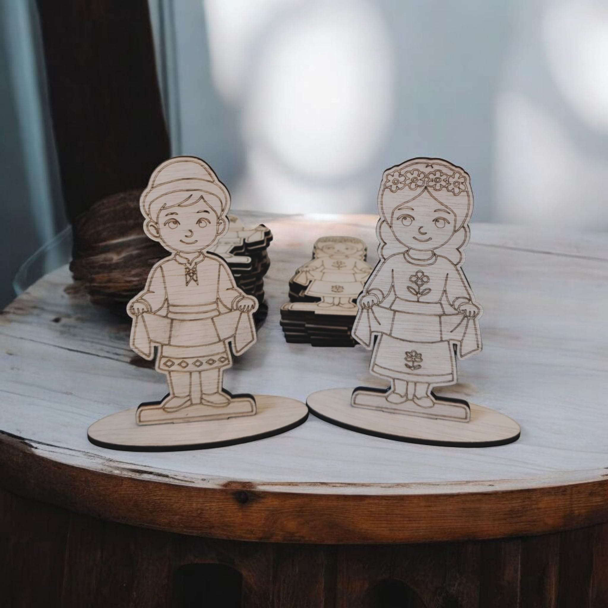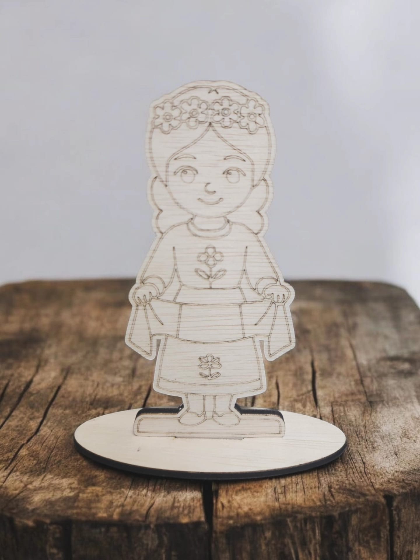 Adaugă farmec și culoare activităților de Ziua României cu această româncuță din lemn natural, un simbol al tradițiilor și portului popular autentic. Cu o înălțime de 15 cm, figurina este perfectă pentru pictat, colorat sau decorat, oferind copiilor ocazia de a-și exprima creativitatea și dragostea față de țară.